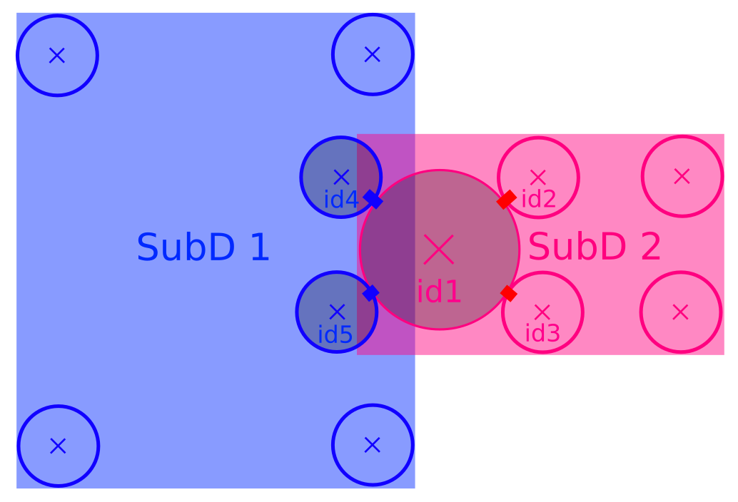 Two overlapping subdomains and their intersections. In this situation we have SubD1.intersections[SubD2.subdomain]=[id4,id5] and SubD1.mirrorIntersections[SubD2.subdomain]=[id1], with SubD1 and SubD2 instances of Subdomain.