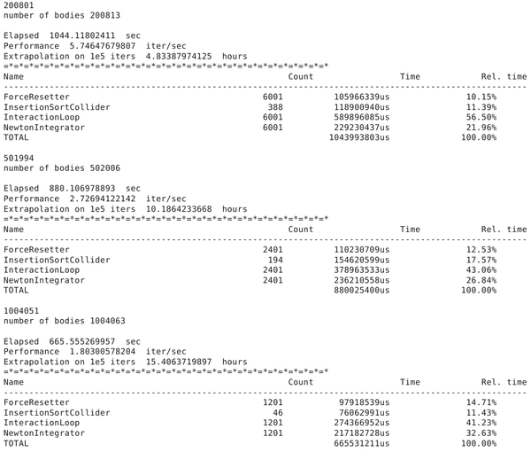 The timing stats suggest that InteractionLoop and NewtonIntegrator are becoming the bottle neck now.